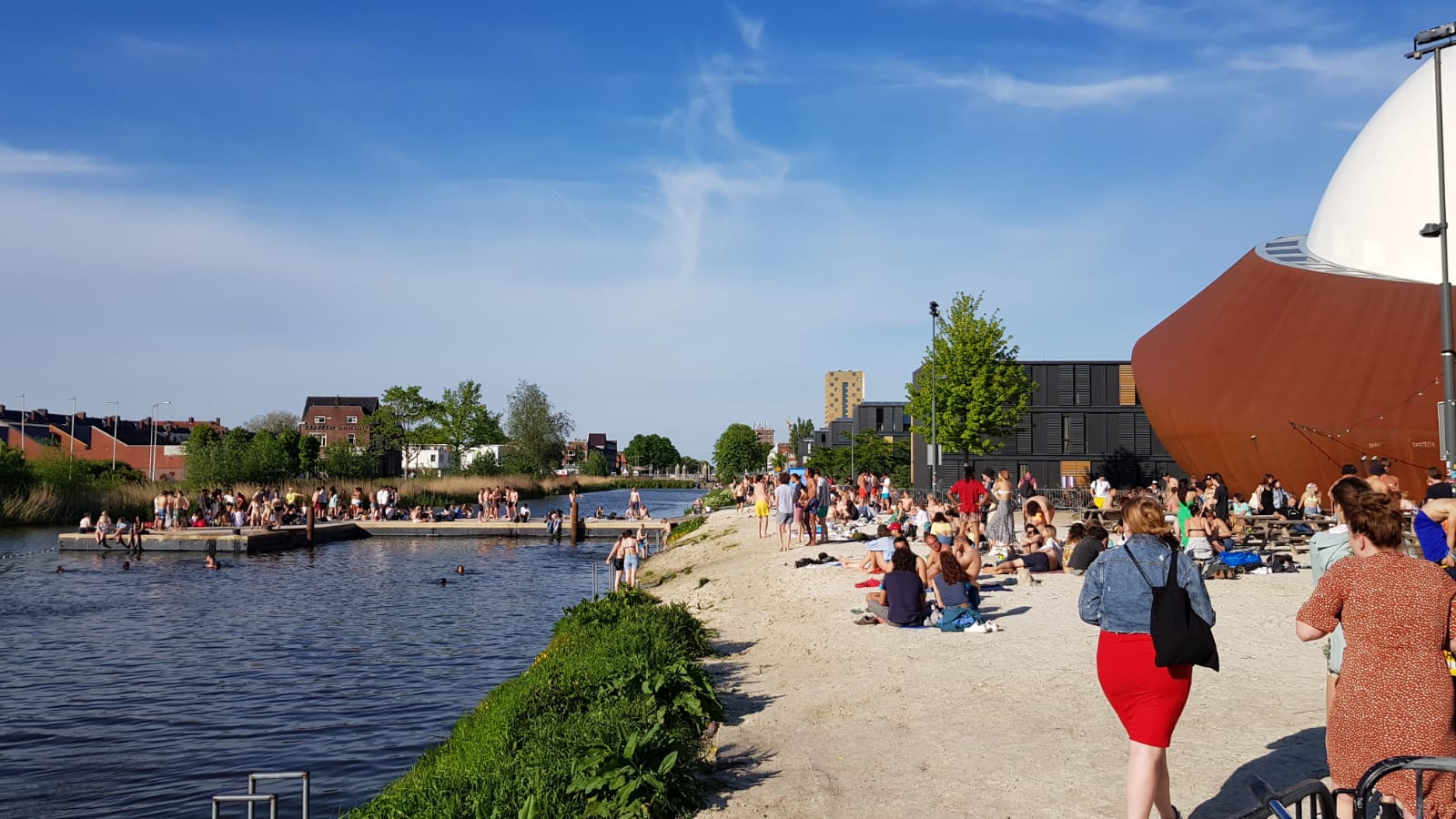 Het is dinsdagavond druk op het stadsstrand in Groningen. Tientallen mensen genieten in en rond het water van de warme dag.