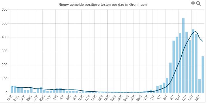 Dat er capaciteitsproblemen zijn bij de laboratoria bevestigt de GGD. Vrijdagavond maakte de Groningse GGD bekend dat er tot komende maandag geen reizigerstesten kunnen worden uitgevoerd omdat het lab dat de testen analyseert de uitslagen niet tijdig kan doorgeven. Behalve in Groningen speelt dit probleem ook in vijf andere regio’s. Ondanks deze beslissing neemt de wachttijd voor reguliere tests nog steeds toe. De gemiddelde wachttijd op een uitslag is nu 18 uur, hoewel dit ook langer kan duren. In Groningen kan het bijvoorbeeld 48 uur duren. “Je ziet dan in de data een opvallende terugval. In Groningen waren er bijvoorbeeld een paar dagen lang 400 positieve tests, en een dag later opeens 100. De combinatie van al die factoren kan de cijfers behoorlijk vertekenen.”