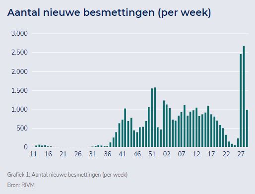 In vergelijking met de cijfers van vorige week woensdag zijn er een aantal grote veranderingen in de leeftijdsverdeling waar nieuwe coronabesmettingen worden vastgesteld. In de leeftijdscategorie 0 tot 14 jaar is de besmettingsgraad gestegen van vorige week 4% naar nu 9%. In de groep 15 tot 19 jaar is de situatie onveranderd gebleven, daar gaat het om een besmettingsgraad van 19%. Een halvering is te zien in de groep van 20 tot 29 jaar. Vorige week ging het om 58%, nu 27%. Een stijging wordt gezien in de groep van 30 tot 65 jaar. Van 19% vorige week naar nu 31%. Ook een stijging in de groep 65 jaar en ouder. Daar stijgt de besmettingsgraad van 1% naar 3%.