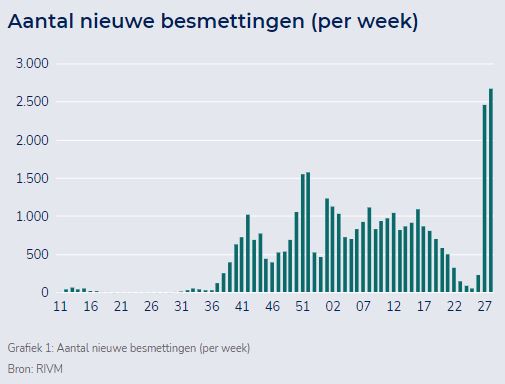 De leeftijdsverdeling van personen met een nieuwe besmetting is de afgelopen week iets veranderd. Het aandeel jong volwassenen blijft met ruim 70% zeer hoog. Het aandeel van personen van 30 jaar en ouder is de afgelopen week toegenomen. In de leeftijdscategorie 0 tot 14 jaar gaat het om een besmettingsgraad van 4%, vorige week was dit 1%. In de groep 15 tot 19 jaar gaat het om 19%, tegenover 20% vorige week. In de leeftijdsgroep 20 tot 29 jaar is de graad gezakt naar 58%, vorige week was dit 74%. In de groep 30 tot 65 jaar gaat het om een stijging van vorige week 6% naar nu 19%. Ook een stijging in de groep 65 jaar en ouder van 0% vorige week naar nu 1%.