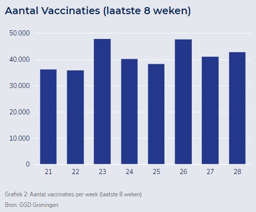 In Groningen werden in de afgelopen week 42.835 vaccinaties gezet. Van de Groningers heeft nu 63% een eerste prik en 43% is volledig gevaccineerd. Sinds begin januari zijn er in Groningen tot nu toe 487.109 prikken gezet. Dit zijn zowel eerste als tweede prikken.