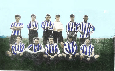Een door De Vries ingekleurde zwart-witfoto van kampioensjaar 1929 laat zien hoe weinig er de afgelopen eeuw aan het tenue is veranderd. Het ballen ging indertijd wel even anders, op een stuk boerenland. ‘Voordat je ging voetballen moest je met een plank over de sloot, de koeien wegjagen en de stront wegschrapen.’