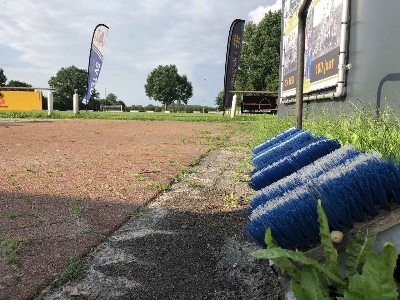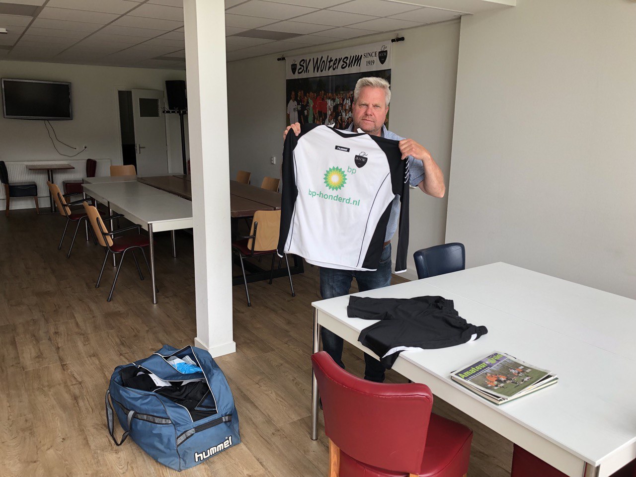 Overigens heeft het oorspronkelijk volledig witte shirt van sv Woltersum tegenwoordig een zwarte mouw, om praktische redenen. ‘Zo’n elleboog wil goed groen worden. Nu hebben we geen blekersveld meer. In de wasmachine moet het schoon worden, dan is een zwarte mouw wel handig.’