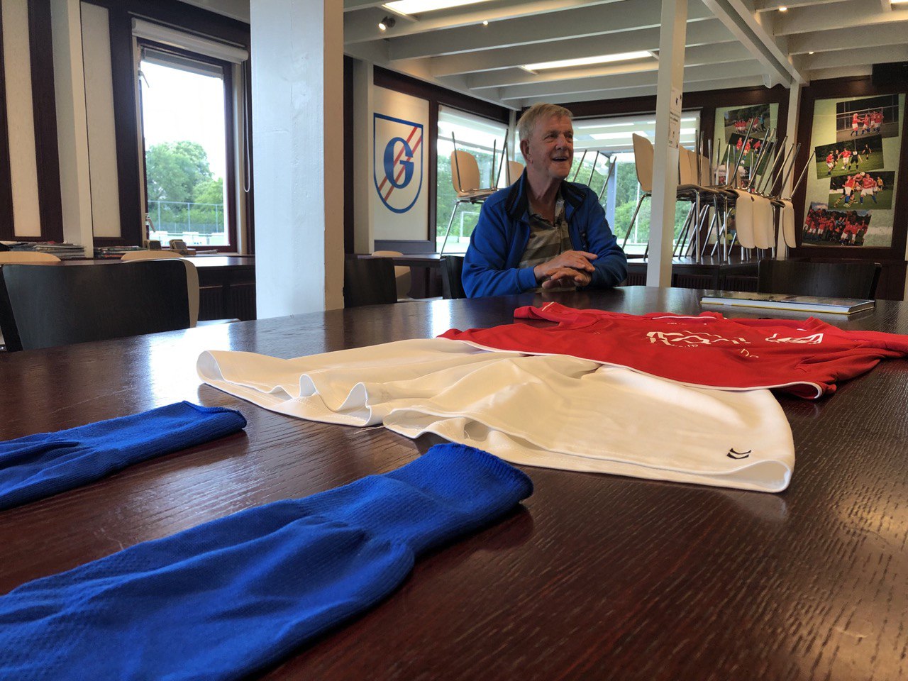 We beginnen onder de rook van Haren, bij vv Glimmen. In de kantine spreidt routinier Ale Hendriks (74) het kleurrijke tenue uit op tafel. Eerst het shirt: rood. Daaronder het broekje: wit. En tot slot de sokken: blauw. ‘Rood, wit, blauw,’ stelt Hendriks terecht. Hoewel de man trots is op zijn Nederlanderschap, is dat niet de gedachte achter dit tenue.