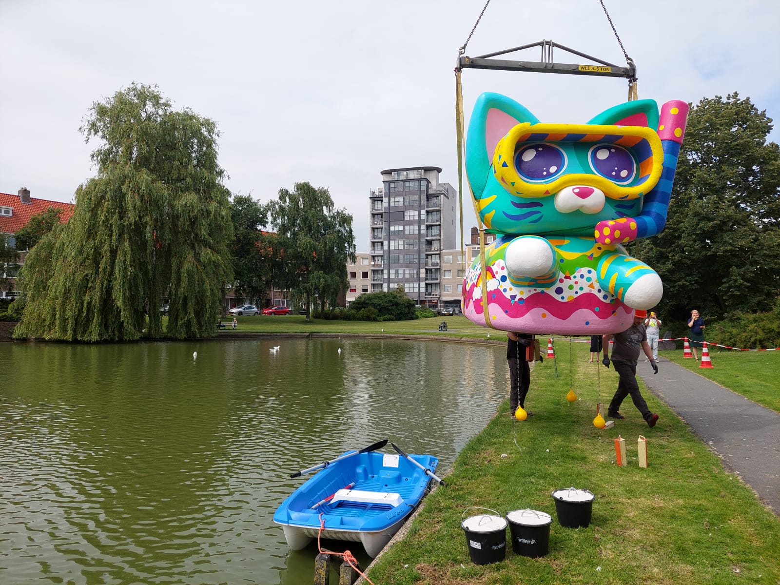 Het enorme kunstwerk de badkat is vrijdag in de Floresvijver in de Indische Buurt getakeld.