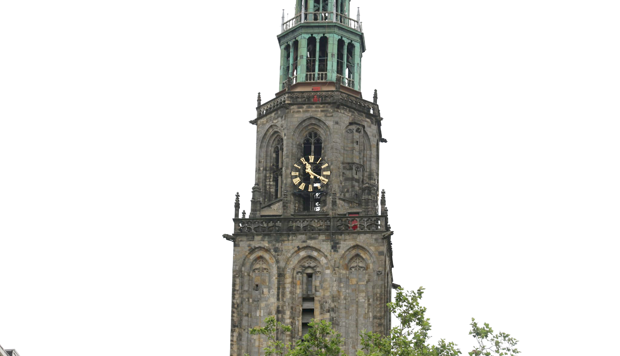 De westelijke klok van de Martinitoren staat sinds vrijdagochtend stil. Terwijl de overige klokken de juiste tijd aangeven, is de westelijke klok op 11.20 uur blijven steken.