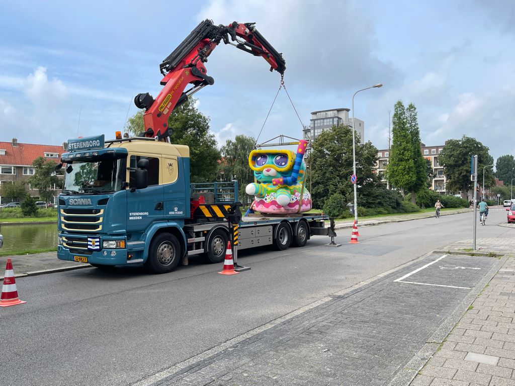 De Badkat met guppy is uitgedobberd in de Floresvijver. Het kunstwerk is zaterdag verplaatst naar het Verbindingskanaal bij het Groninger Museum.
