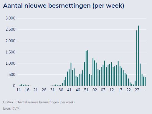 De leeftijdsverdeling van mensen bij wie een coronabesmetting is vastgesteld kent in vergelijking met vorige week kleine verschuivingen. In de leeftijdsgroep 0 tot 14 jaar gaat het om een besmettingsgraad van 14%, vorige week was dit 12%. In de groep 15 tot 19 jaar gaat het om 11%, vorige week was dit 16%. In de categorie 20 tot 29 jaar gaat het om 34%, vorige week was dit 32%. In de groep 30 tot 65 jaar is de besmettingsgraad gedaald van 38% naar 37%. En in de categorie ouder dan 65 jaar gaat het om een stijging van 3% naar 4%.
