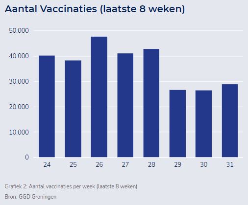 In de afgelopen week zijn er in de provincie 24.193 prikken gezet op de verschillende vaccinatielocaties. Van de Groningers heeft nu 66,1% een eerste prik gekregen en 61,3% is volledig gevaccineerd. Op dit moment kunnen er mensen geboren in of voor 1955, mensen geboren in 1961 tot en met 2003, medische risicogroepen, zorgpersoneel, dak- en thuislozen, vrouwen in de vrouwenopvang, sekswerkers, arbeidsmigranten en jongeren van 12 tot 17 jaar gevaccineerd worden. Sinds het begin van de vaccinatiecampagne zijn er in de provincie nu 636.404 prikken gezet. Dit zijn zowel eerste als tweede prikken.