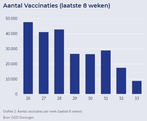 De GGD laat in haar wekelijkse update weten dat er in de afgelopen zeven dagen 7.533 vaccinaties zijn gezet. “Van de Groningers heeft nu 79% een eerste prik gekregen, en is 73% volledig gevaccineerd”, schrijft de GGD. “Iedereen van 12 jaar en ouder kan zich laten vaccineren. Sinds het begin van de vaccinatiecampagne in januari van dit jaar zijn er in de provincie 670.340 prikken gezet. Dit zijn zowel eerste als tweede prikken.”