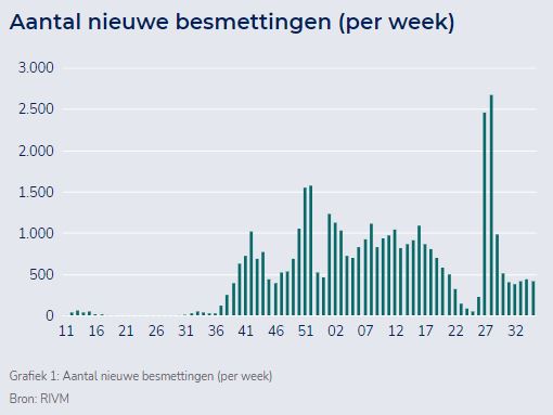 De leeftijdsverdeling van personen met een nieuwe coronabesmetting is in vergelijking met vorige week verschoven. De besmettingsgraad bij kinderen in de leeftijd van 0 tot 14 jaar steeg van 17% naar 26%. In de groep van 15 tot 19 jaar gaat de besmettingsgraad van 11% naar 10%. In de categorie 20 tot 29 jaar ging het vorige week om 32%, nu om 24%. In de leeftijdsgroep 30 tot 65 jaar is de besmettingsgraad stabiel van 35% vorige week naar 36% deze week. In de groep ouder dan 65 jaar lag de besmettingsgraad deze week op 4% tegenover 5% vorige week.