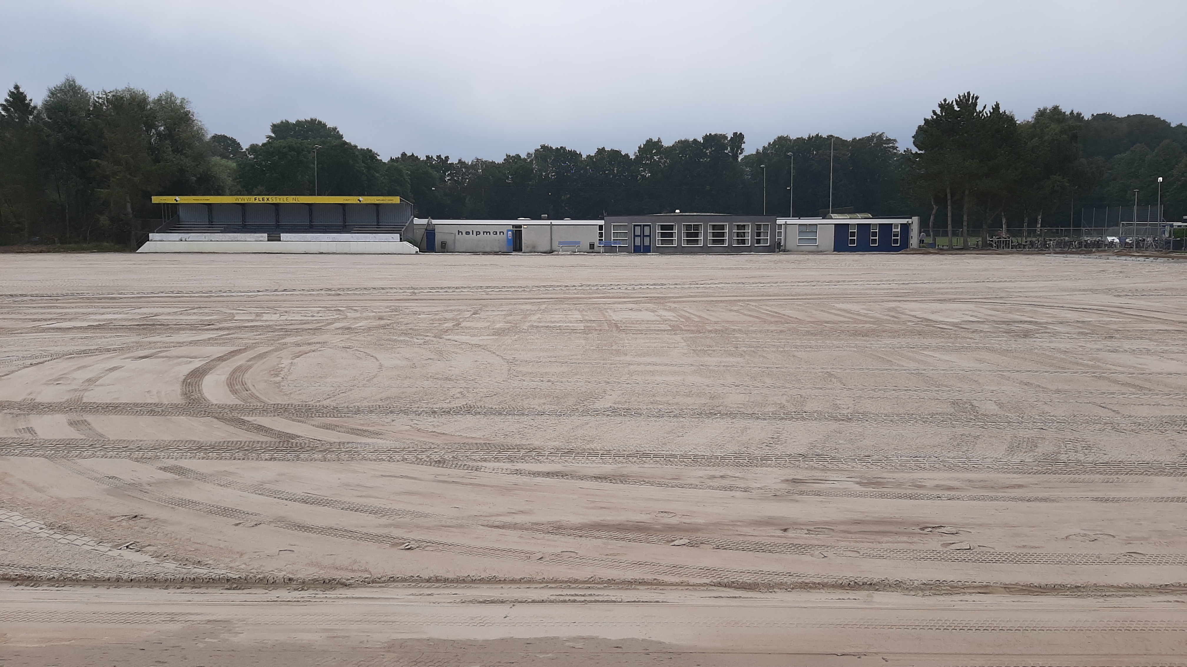 Het hoofdveld van voetbalvereniging Helpman op sportpark Esserberg is momenteel één grote zandvlakte, maar dat gaat snel veranderen.