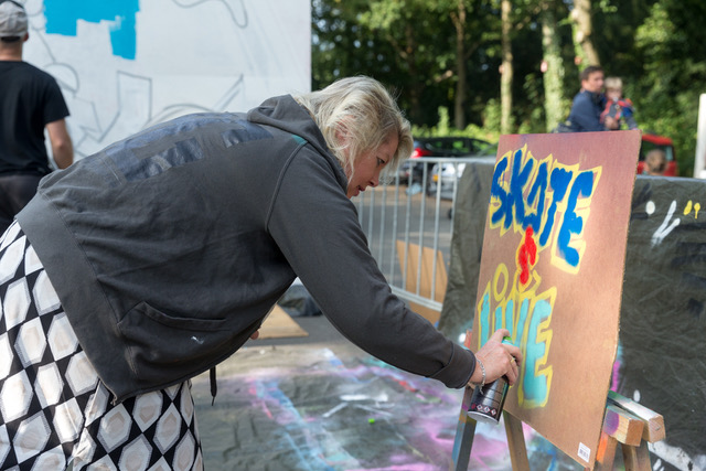 “We zijn vanochtend om 10.30 uur begonnen”, vertelt Bettie Fischer van de organisatie. “We hadden wethouder Jongman (ChristenUnie) van Sport uitgenodigd om de openingshandeling te verrichten. Deze openingshandeling bestond uit het maken van een graffitikunstwerk. En eerlijk is eerlijk, dat ging onze wethouder erg goed af. Ze was zelf ook behoorlijk onder de indruk, haha. De bedoeling is ook dat het kunstwerk straks een plekje gaat krijgen op haar werkkamer in het nieuwe stadhuis. Wel was er nog wat discussie over de naam van het kunstwerk. De jongeren, die assisteerden, wilden het skate or die noemen. Maar de wethouder leek het beter om er skate and live van te maken.”