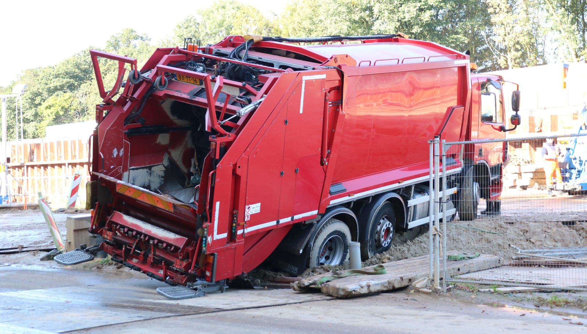 Het voertuig zat muurvast en moet daarom met een kraan van de zandheuvel worden afgetild. Vervolgens zal een bergingsvoertuig de vuilniswagen afslepen.
