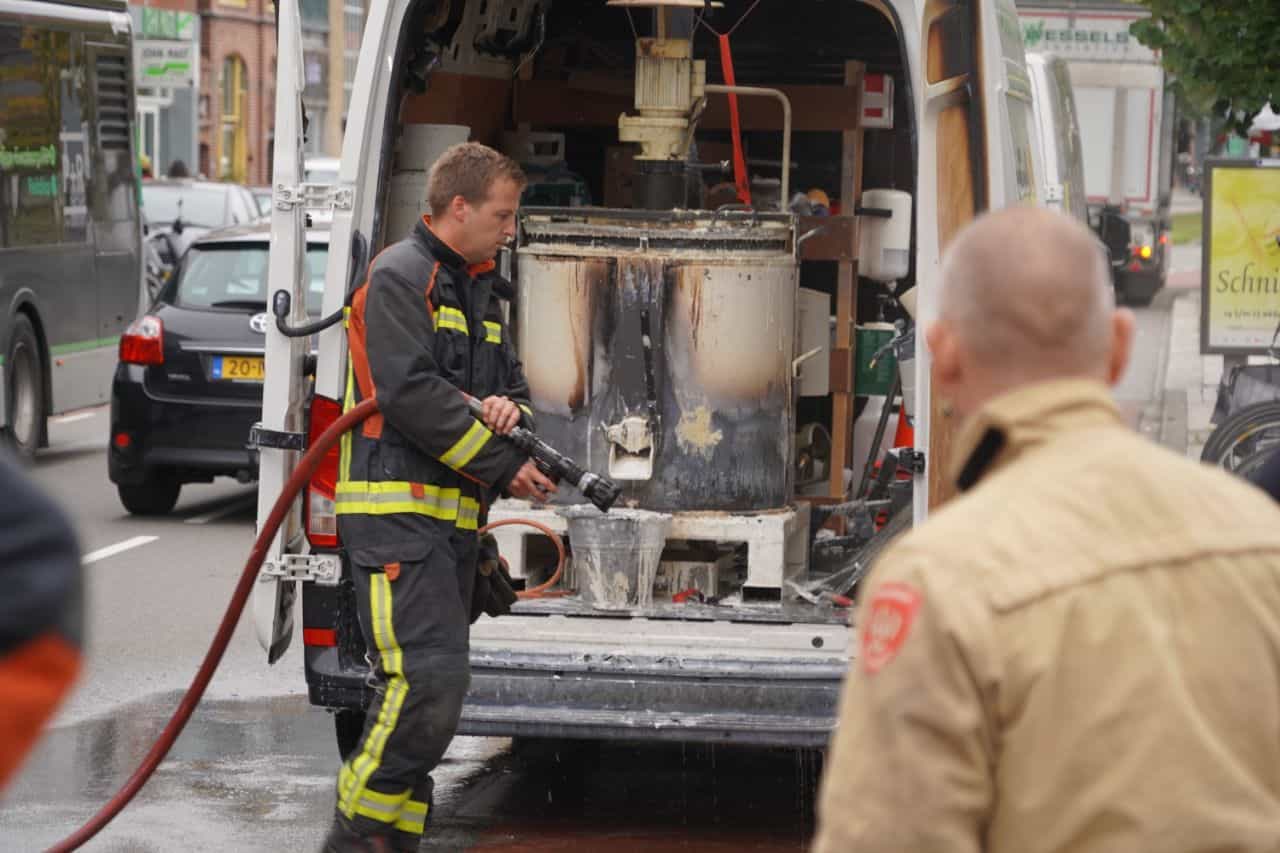 De brandweer heeft de brand geblust. Er ontstond schade aan de apparatuur in de wagen. Ook het voertuig zelf raakte beschadigd.