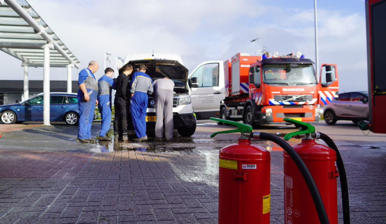 Eenmaal ter plaatse controleerden de brandweerlieden of de brand in de bedrijfsauto echt voorbij was. Maar het garagepersoneel bleek goed werk te hebben verricht, door snel twee brandblussers leeg te spuiten onder de motorkap van het voertuig.