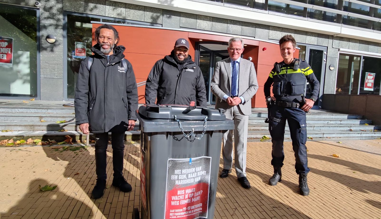 Ook wijkagent Eva Dijkman van de politie en jongerenwerkers Shem Rogers en Risendly Reigina van WIJ Groningen waren maandagmiddag aanwezig aan de Rademarkt, om de inleverton voor de steekwapens en stootwapens te laten zien aan het publiek.