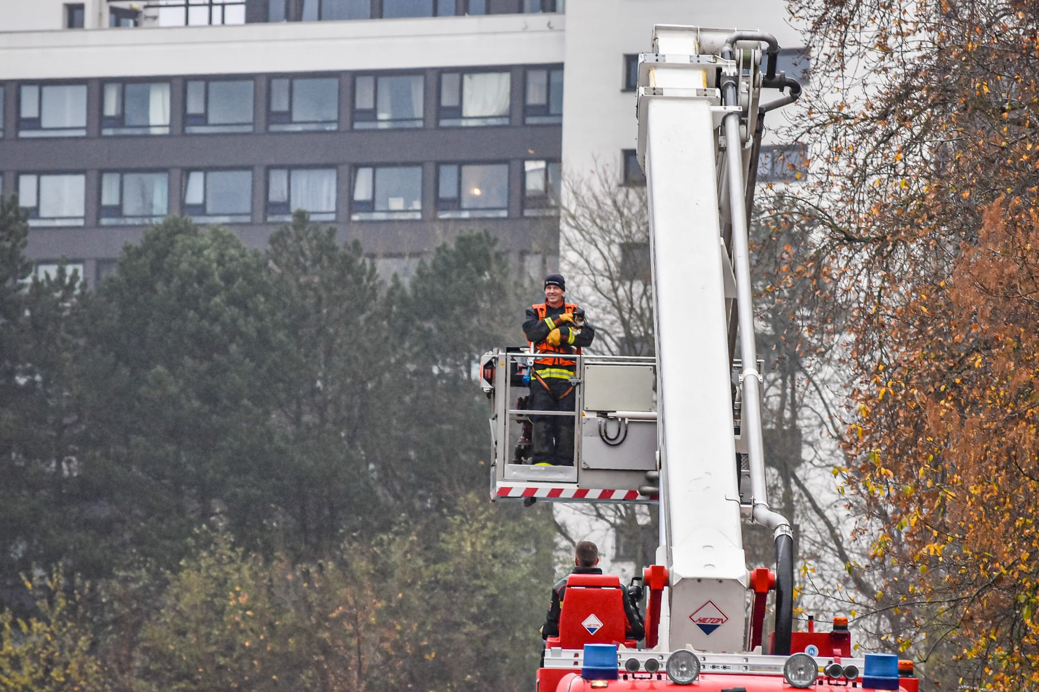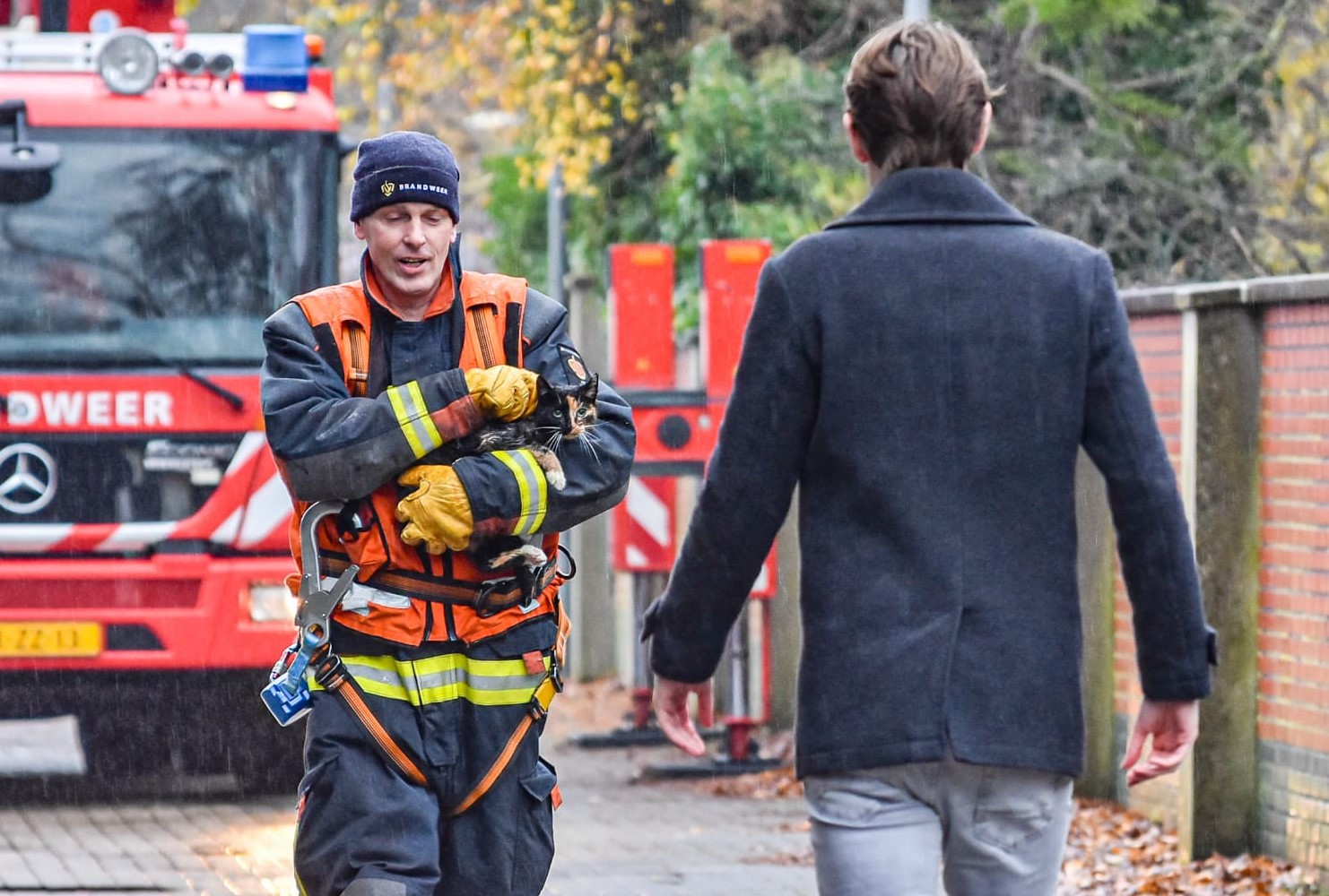 Na het opstellen van de hoogwerker kon het dier snel gered worden. “De kat, die helemaal doorweekt was, werd in de armen van een brandweerman naar beneden gebracht. Eenmaal op de grond vond de hereniging met het baasje plaats.”