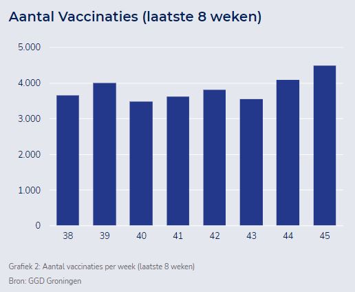 In de afgelopen week werden 4.504 vaccinaties gezet door de GGD Groningen. “Het gaat om 2.417 mensen die een eerste prik hebben ontvangen”, schrijft de GGD. “Van de Groningers heeft nu 83,6% een eerste prik gekregen en is 81,4% volledig gevaccineerd,” Sinds begin dit jaar heeft de GGD tot nu toe 711.526 prikken gezet. Het gaat om zowel eerste, tweede als derde prikken. Komende vrijdag start de GGD met het geven van een boosterprik aan 80-plussers. Eind december volgen de 60 tot 79-jarigen. “Tegelijkertijd wordt er door ons ook een boostervaccinatiecampagne voor bewoners van zorginstellingen zonder medische dienst en niet mobiele thuiswonenden voorbereid.”