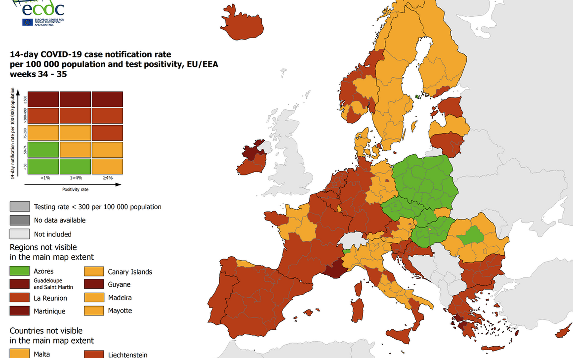De coronakaart wordt elke donderdag vastgesteld door de Europese gezondheidsdienst ECDC. Die kijkt naar het aantal en het percentage positieve tests in de twee vorige kalenderweken. De Europese coronakaart heeft vier kleuren. Van laag naar hoog zijn dat groen, oranje, rood en donkerrood.