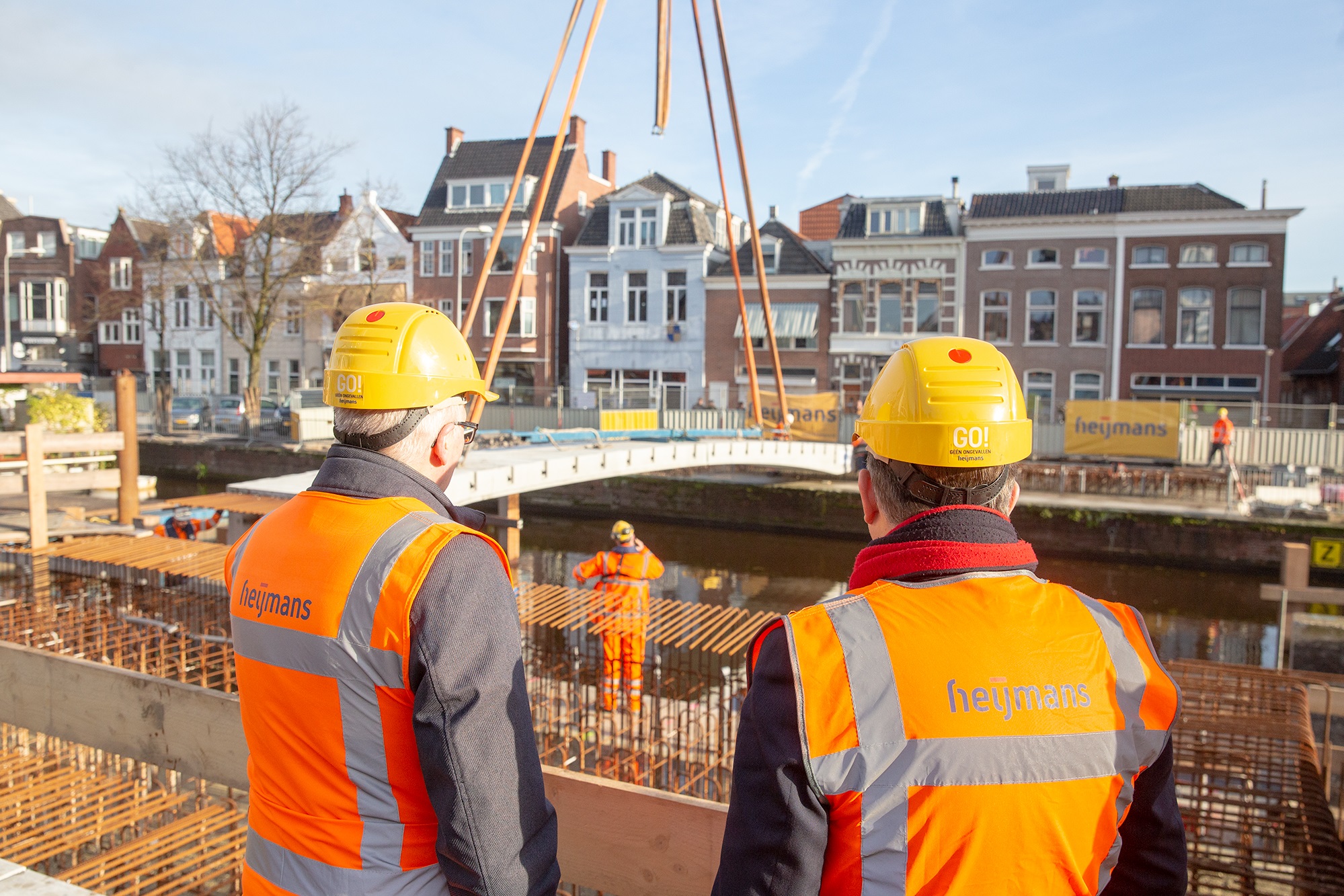 Twee tevreden wethouders (links Philip Broeksma, rechts Roeland van der Schaaf) kijken naar het inhijsen van het brugdek voor de Kattenbrug – Foto: Henk Tammens voor gemeente Groningen
