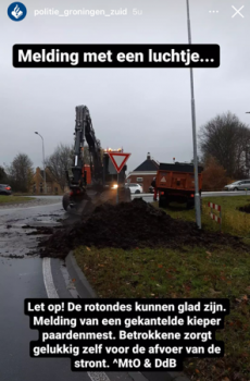 Het ongeluk gebeurde in de tweede helft van de middag op de rotonde Winschoterweg met de N860. Een kipper, een type kiepwagen, reed over de rotonde en kantelde in een bocht. “De rotondes kunnen in deze periode van het jaar glad zijn”, meldt de politie. De inhoud van de kipper kwam deels op de weg, en deels in de berm terecht. “De betrokkene zorgt gelukkig zelf voor de afvoer van de mest.”