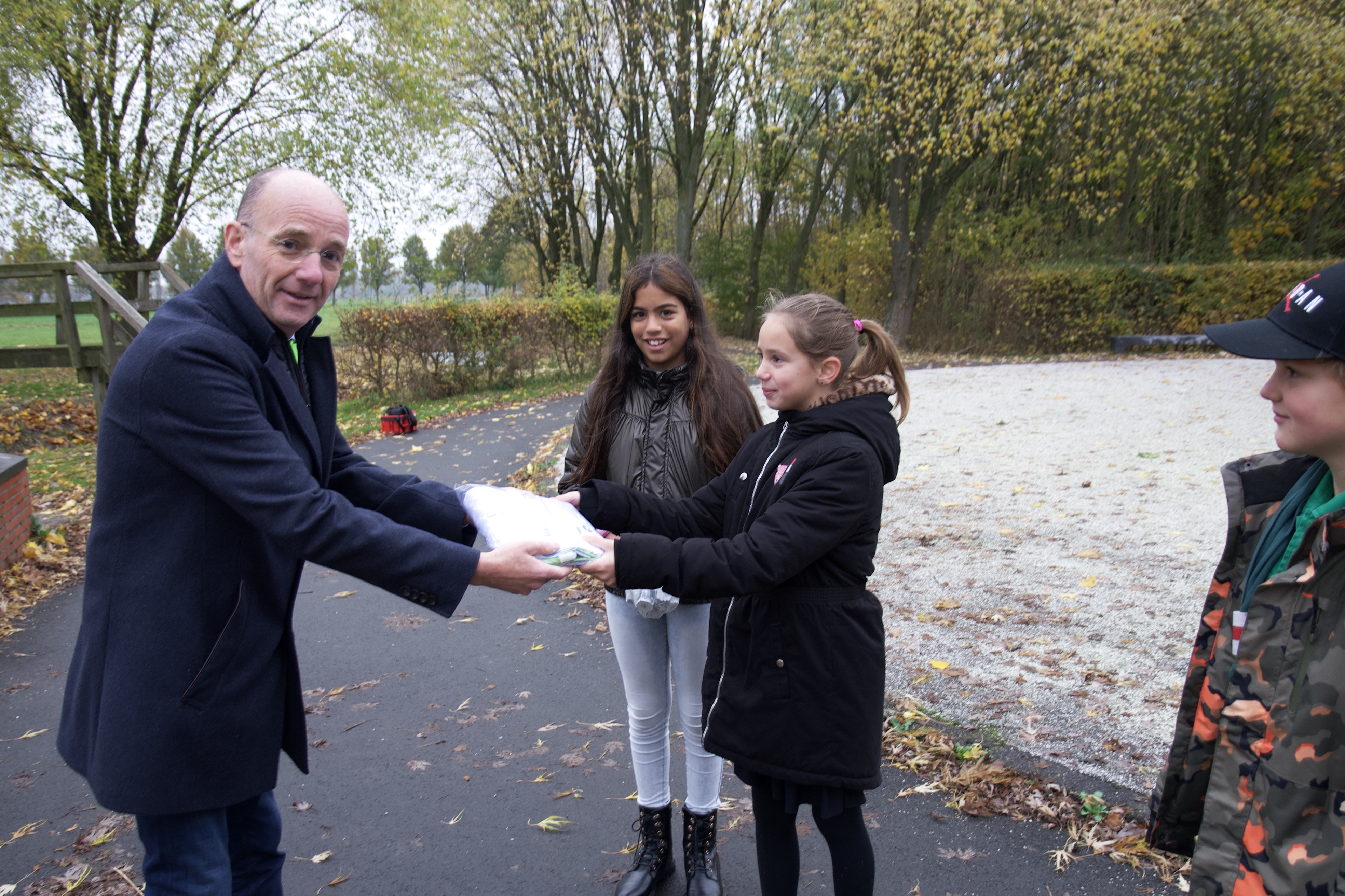 De speciale vlag is ontworpen door leerlingen van Het Palet. Links voorzitter John van der Woude van het Bevrijdingsbos. Foto: Gert Vos