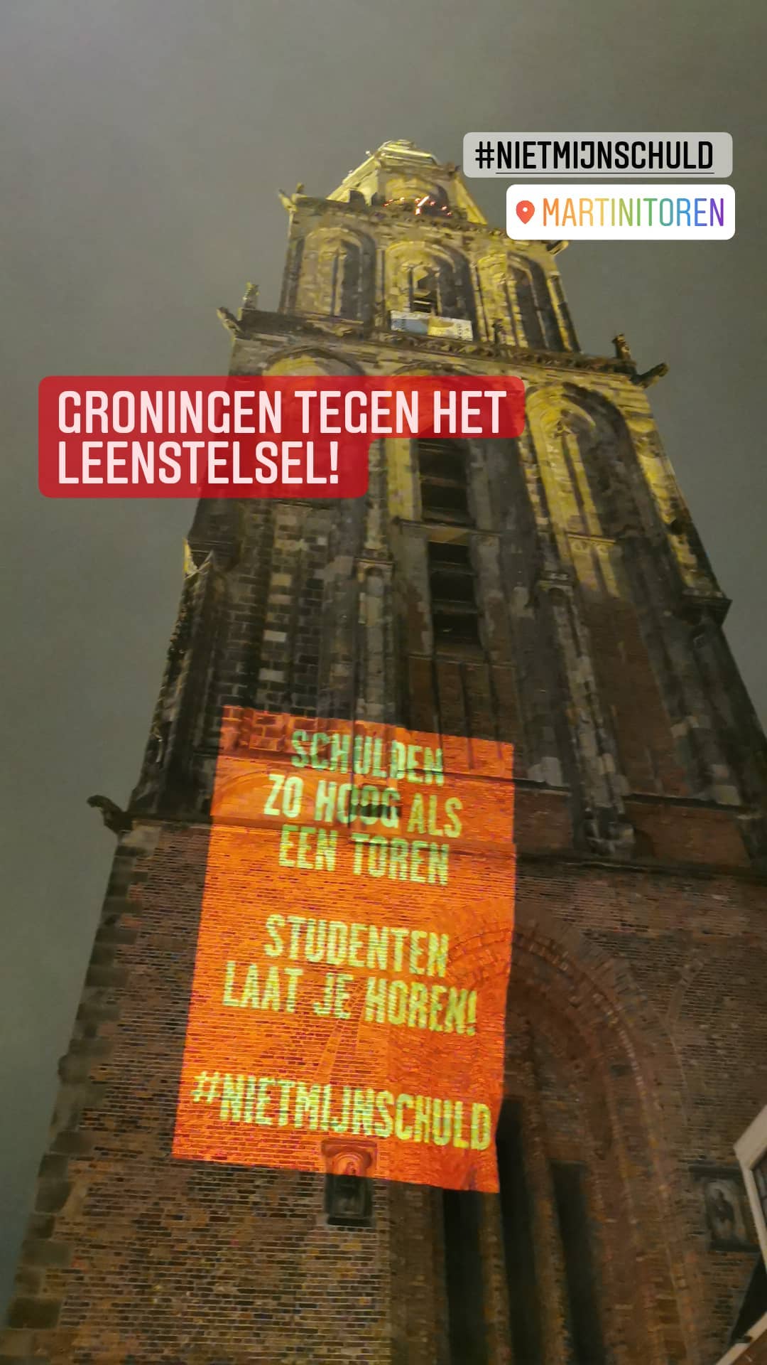 Verschillende Groningse studentenorganisaties organiseerden donderdagavond een protestactie tegen het leenstelsel op de Grote Markt. Tijdens deze actie werd de boodschap van de studenten metershoog op de Martinitoren geprojecteerd.