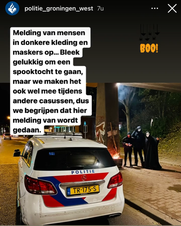 Op de meldkamer was een melding binnengekomen over mensen in donkere kleding en met maskers op. Agenten gingen daarop een kijkje nemen. De personen werden aangetroffen nabij het Selwerderhof. “Het bleek te gaan om een spooktocht”, schrijft de politie. “Maar we maken vergelijkbare outfits ook wel eens mee tijdens andere casussen, dus we begrijpen dat hier melding van werd gemaakt.”