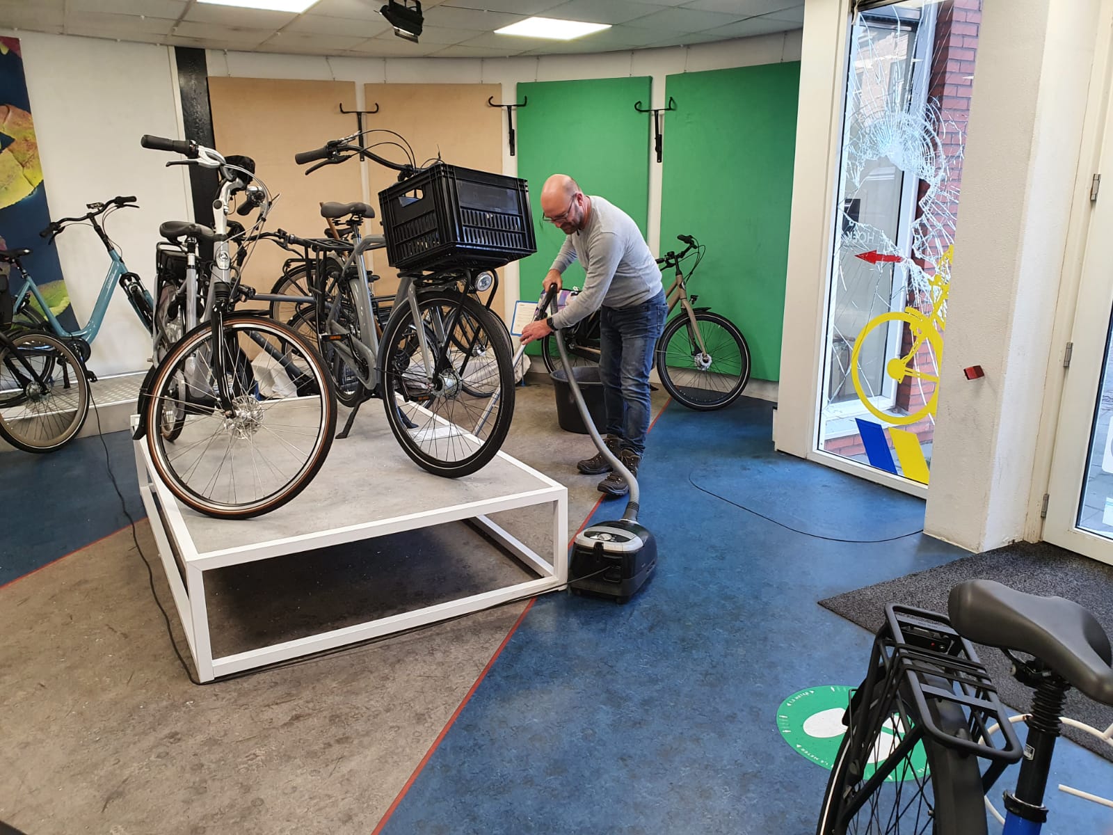 Een verkoper van fietsen aan de Moesstraat is maandagochtend druk bezig met stofzuigen. Meerdere ruiten van de winkel werden kapotgeslagen.