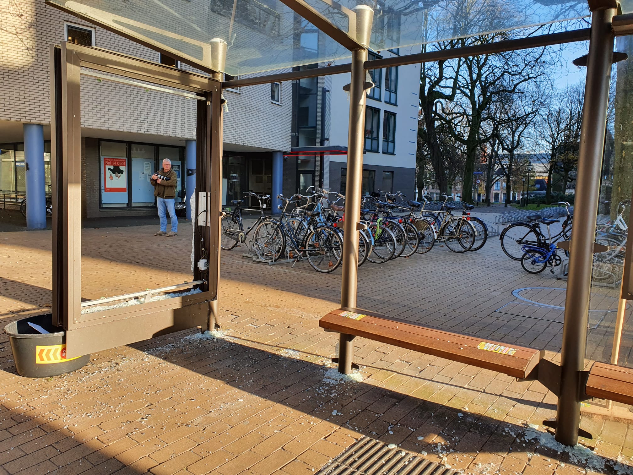 Meerdere bushokjes moesten het ongelden bij de relschoppers. Opruimploegen en glaszetters waren maandagochtend dan ook druk op verschillende plekken om de schade te herstellen, waaronder hier aan de Grote Markt.