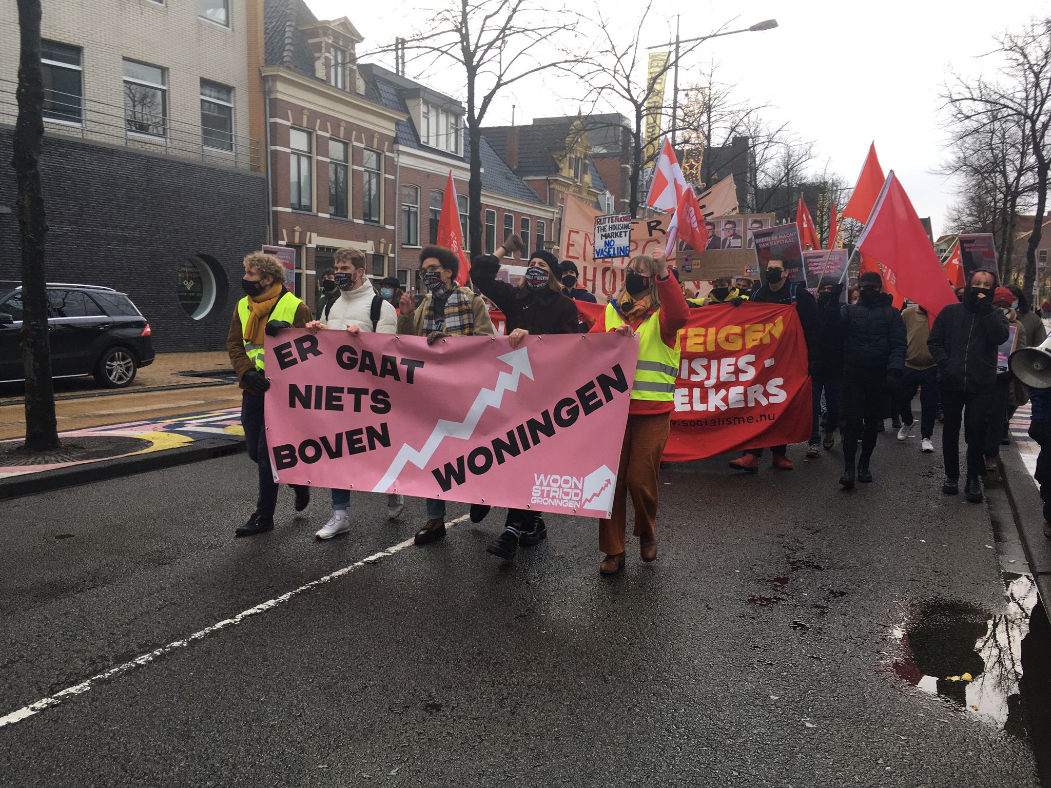 Volgens verslaggeefster Danja de Jonckheere hebben zich rond 14.00 uur verschillende organisaties verzameld op de Vismarkt, waaronder de jongeren van de SP, de PvdA, GroenLinks en de Groninger Studentenbond. Men draagt spandoeken bij zich waarop staat te lezen: ‘Wonen is een recht’ en ‘Onteigen huisjesmelkers’. Bij de actie houdt men zich aan de anderhalvemeterregel en worden er mondkapjes gedragen. De actie in Groningen wordt georganiseerd onder de noemer Woonstrijd. Eerder werd er al actie gevoerd in Amsterdam, Rotterdam en Den Haag. De actie in Groningen begint met verschillende toespraken op de Vismarkt, waarna er een mars door de stad wordt gelopen.