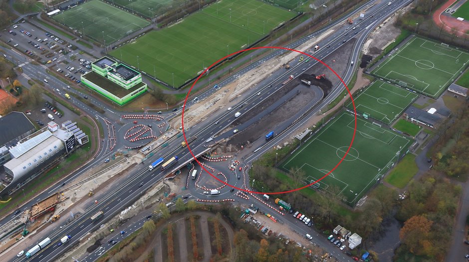 Daarna, bij de voetbalvelden van Velocitas 1897, begint de afrit. De scherpe bocht is nodig omdat er bij de voetbalvelden weinig ruimte is tussen de ringweg en de oprit richting Drachten. Om de nieuwe afrit aan te sluiten op de ringweg, is de ringweg in de nacht van woensdag 15 op donderdag 16 december dicht vanaf afrit 36 tot oprit 36a. Het verkeer wordt dan omgeleid met gele borden.