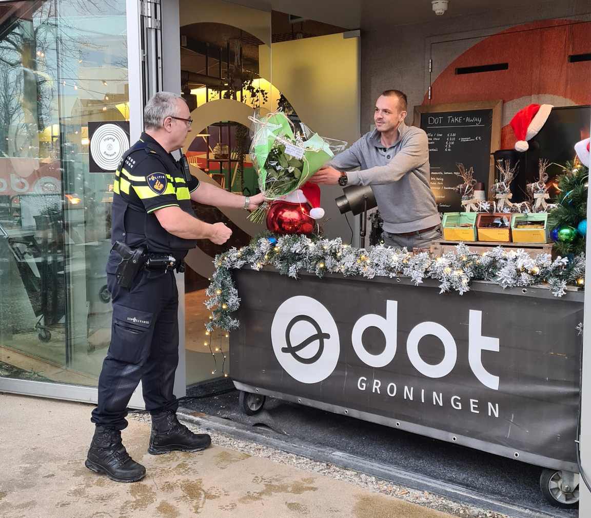 De hulpverleningsdiensten hebben vrijdag een bos bloemen overhandigd aan medewerkers van de horecaonderneming DOT, omdat die woensdag mensen hebben opgevangen uit een wooncomplex.