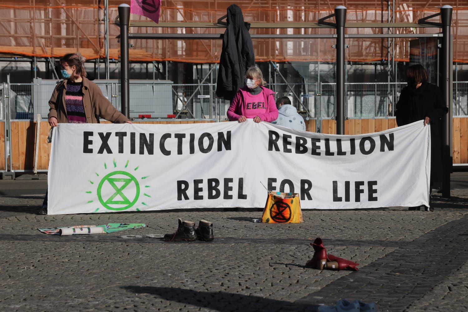De mensen van Extinction Rebellion lopen in kleur en met paraplu over de Vismarkt, waar ze gemakkelijk 1,5 meter afstand kunnen houden. Tijdens het luchtalarm om 12.00 uur vallen ze (wanneer het weer dit toelaat) ‘dood’ neer. De actie wordt in stilte gevoerd, want hun boodschap staat op spandoeken, aldus Extinction Rebellion.