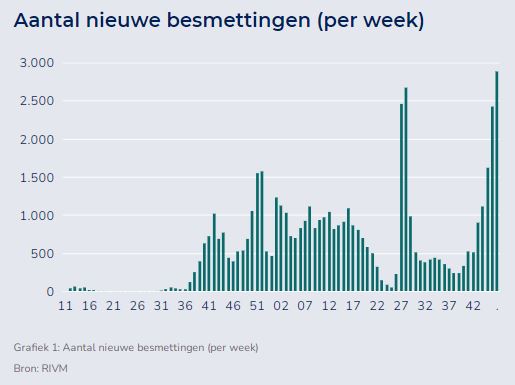 Sinds vorige week woensdag zijn er in de provincie Groningen 3.208 nieuwe besmettingen bijgekomen. “Dit is een lichte stijging ten opzichte van de week hiervoor, toen er 3.010 nieuwe besmettingen bij kwamen. De besmettingsgraad ligt in onze regio op 544 gevallen per 100.000 inwoners, dit ligt nog ruim onder het landelijk gemiddelde van 888 per 100.000 inwoners. Het aantal ziekenhuisopnames is toegenomen naar 69,9 per 1.000.000 inwoners.” Sinds het begin van de coronapandemie zijn er in de provincie tot nu toe 62.415 personen positief getest.