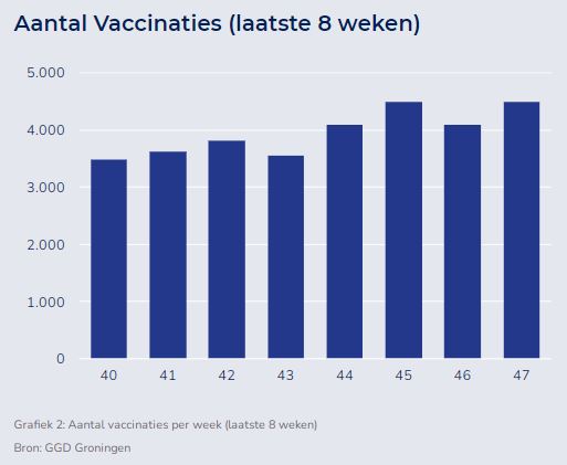 In de afgelopen week werden er in de provincie 4.504 vaccinaties gezet. Het gaat hierbij om ruim 1.000 mensen die een eerste prik ontvingen. “Van de Groningers heeft 84,2% een eerste prik gekregen en 82,1% is volledig gevaccineerd”, schrijft de GGD. Sinds het begin van de vaccinatiecampagne zijn er tot nu toe 722.390 prikken gezet door de GGD. Het gaat hier om zowel eerste, tweede, derde als boosterprikken.