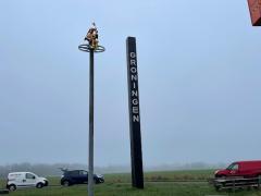 De joker bovenop de stadsmarkering langs de A7 bij Harkstede is donderdag teruggeplaatst op zijn hoge sokkel. De joker kijkt sinds 1990 neer op het verkeer langs de rijksweg.