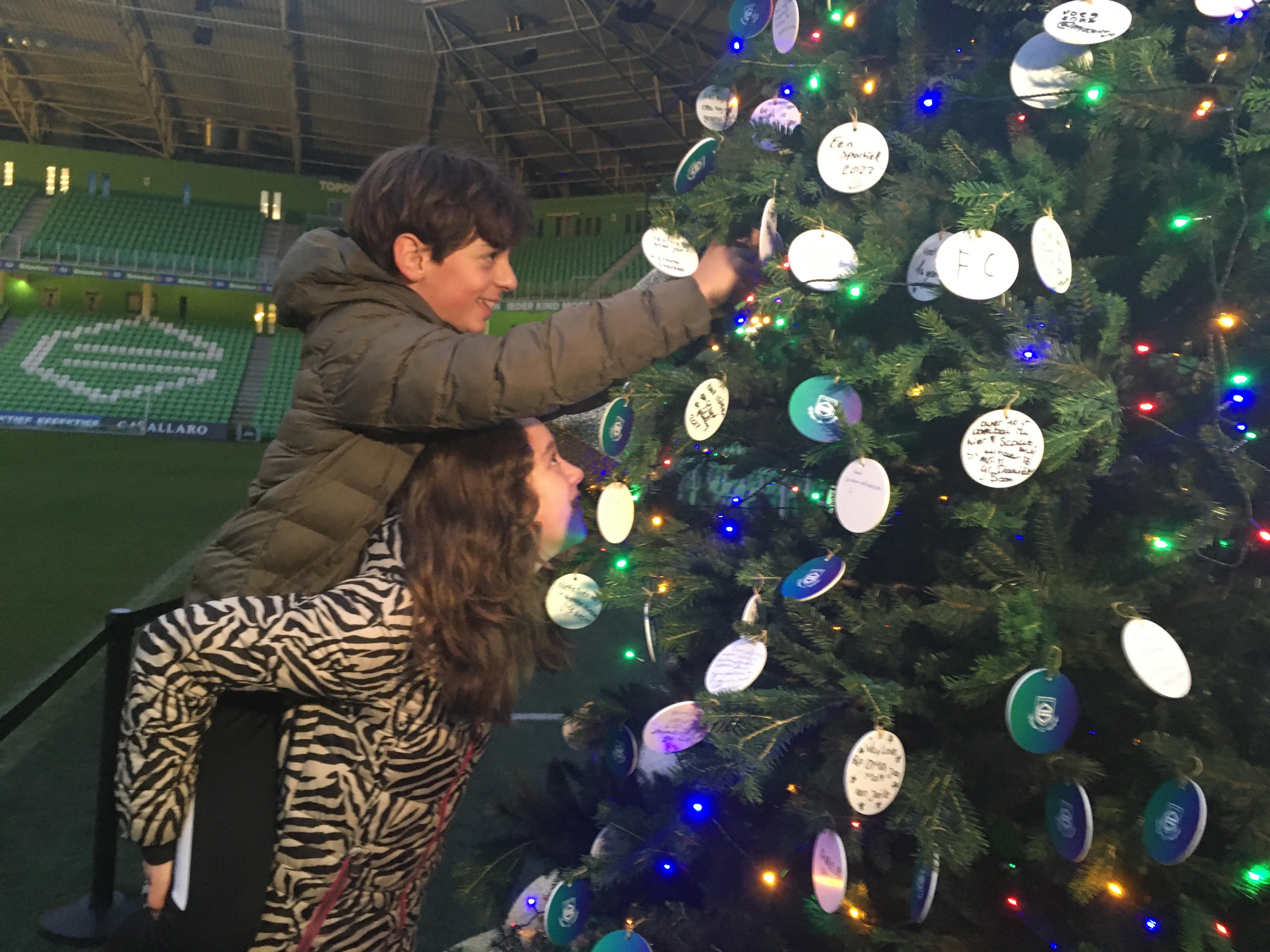 Naast het veld was een kerstboom opgetuigd waar mensen een kerstboodschap achter konden laten. Dat zorgde voor veel verhalen. “We hebben hele heftige, maar ook hele vrolijke verhalen gehad,” vertelt Frank Veenhof van FC Groningen. “In het begin van de week hadden we hier een meisje dat heel graag wilde gaan voetballen, dus zij wil dat er een damesteam komt zodat ze ook in dit stadion kan voetballen.”