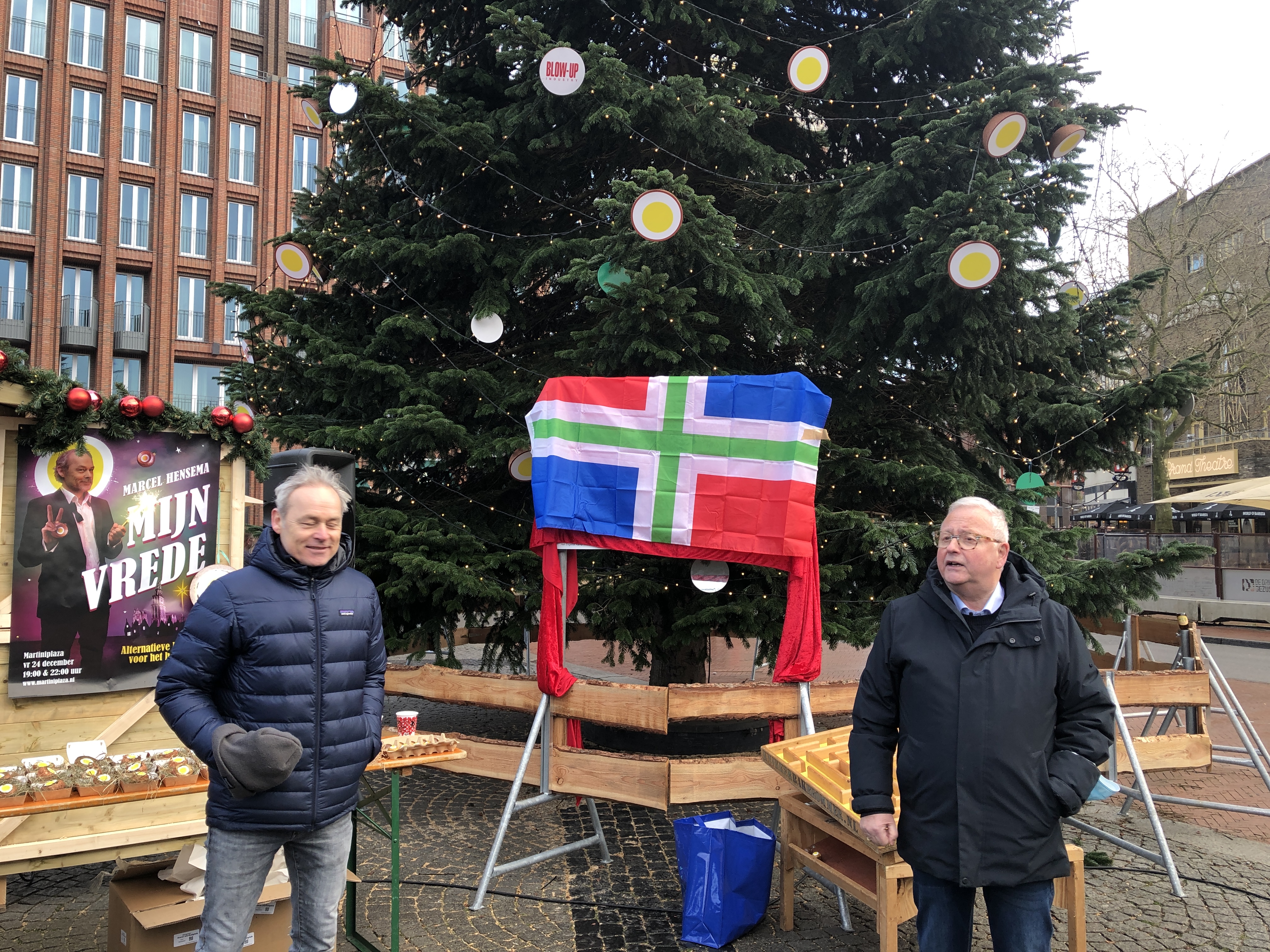De kerstboom op de Grote Markt in Groningen is versierd met 100 grote ‘kersteierballen’, die door organisaties gekocht zijn. De opbrengst gaat JINC, een organisatie die zich inzet voor de kansgelijkheid van kwetsbare jongeren.