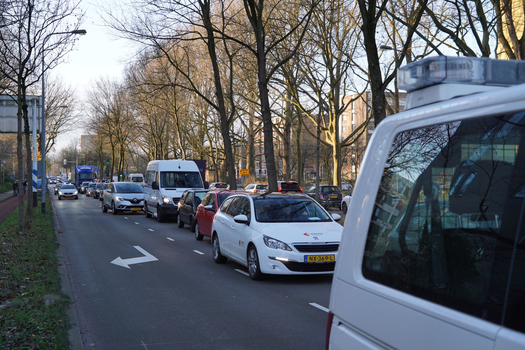 Kort na half drie op de woensdagmiddag kwamen twee personenauto’s met elkaar in botsing op de Laan Corpus den Hoorn. De daarop volgende wegafzetting zorgde voor grote verkeersdrukte.