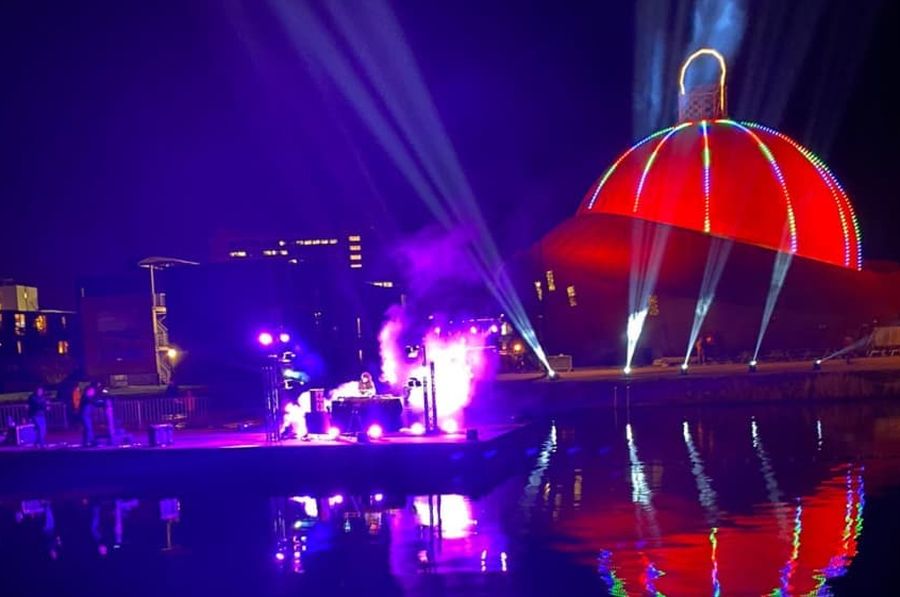 Zeven dj’s uit Groningen draaiden maandagavond een set op een drijvend podium langs het Stadsstrand bij DOT. Het optreden is onderdeel van Project Kerstbal. Dat is een initiatief waarbij een livestream wordt geproduceerd en uitgezonden. Tegelijkertijd wordt er geld opgehaald voor de Voedselbank in Groningen.