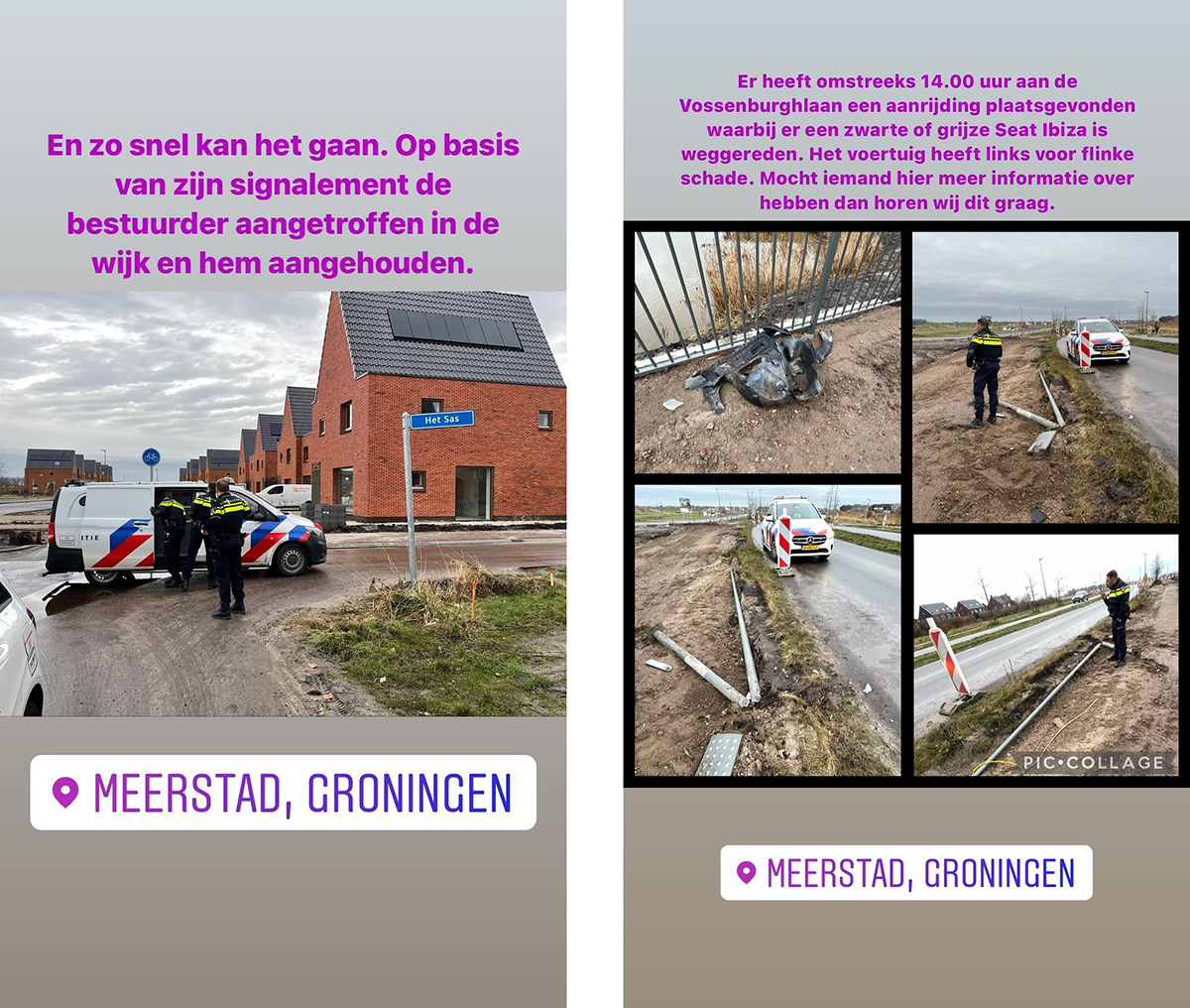 Een verkeersongeval op de Vossenburglaan in Meerstad zorgde woensdagmiddag voor flinke schade aan wegmeubilair en voertuigen. Een van de betrokken bestuurders wachtte de komst van de hulpdiensten echter niet af en reed door. Na een korte zoekactie in de wijk wist de politie hem te vinden.