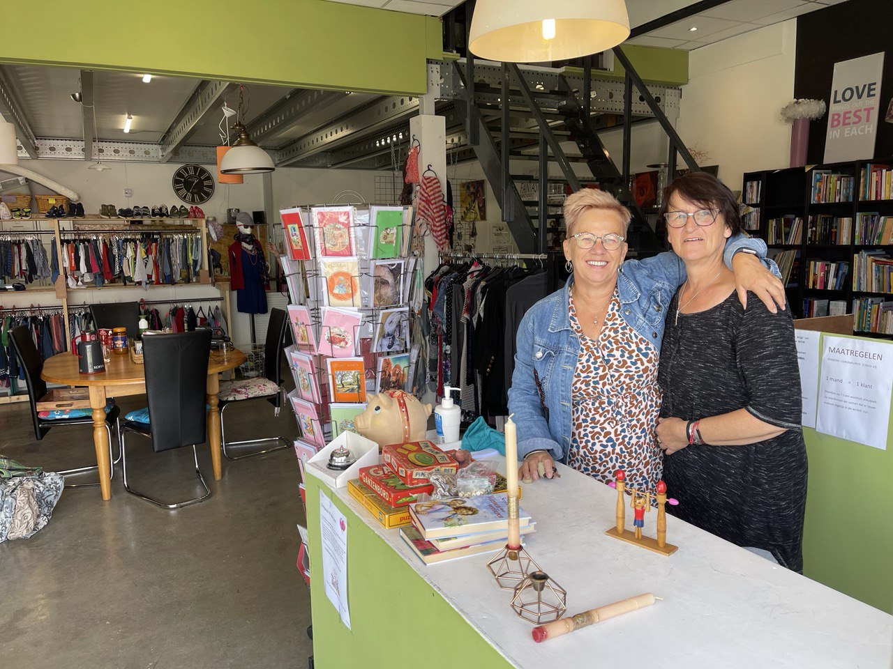 Vrijwilligers Sjani van Dijk (l) en Wilma Huisman (r) in het nieuwste pand van Weggeefwinkel Ten Boer (Foto: Bram Koster)