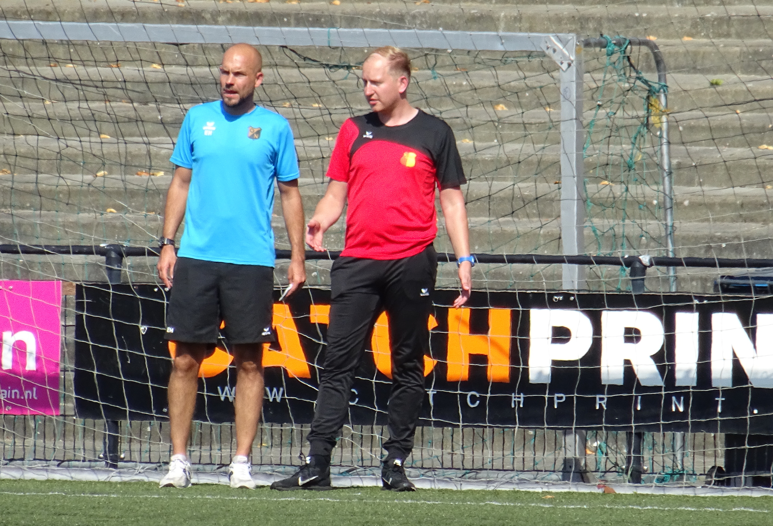 Foto Andor Heij: Overleg tussen ON trainer Erwin Heerlijn (l) en Be Quick trainer Steven Wuestenenk