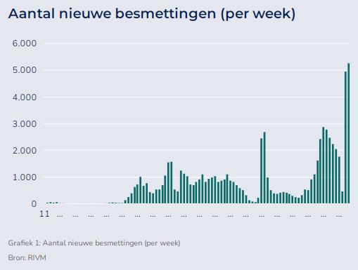 De meeste besmettingen werden afgelopen week ontdekt in de gemeente Oldambt. Daar ging het om 1.353 nieuwe besmettingen per 100.000 inwoners. In de gemeente Groningen ging het in de afgelopen zeven dagen om 1.341 nieuwe gevallen per 100.000 inwoners, Stadskanaal 1.332, Westerwolde 1.259 en Pekela 1.117.