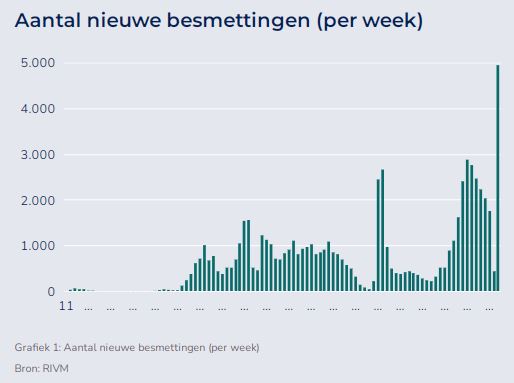 De leeftijdsverdeling van personen met een nieuwe besmetting kent in vergelijking met vorige week verschuivingen. Zo is het aandeel nieuwe besmettingen onder 20 tot 29 jarigen fors toegenomen. In de leeftijdscategorie 0 tot 14 jaar gaat het om een besmettingsgraad van 7%, tegenover 12% vorige week. In de groep 15 tot 19 jaar een stijging van 9% naar 13% afgelopen week. In de categorie 20 tot 29 jaar gaat het om een stijging van 25% naar 44%. In de leeftijdsgroep 30 tot 65 jaar is er een afname van vorige week 47% naar nu 32%. In de categorie 65 jaar en ouder blijft de besmettingsgraad ongeveer gelijk van 8% vorige week naar 7% deze week.