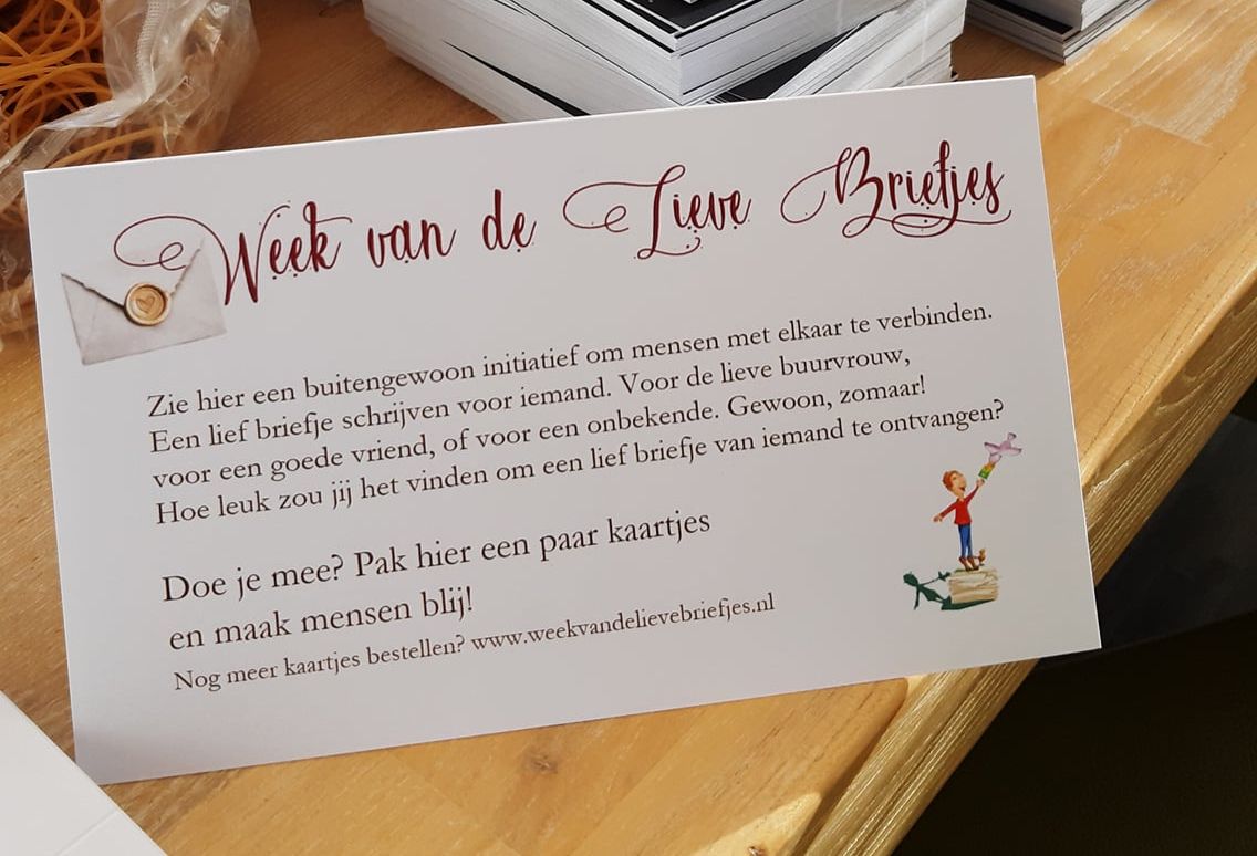 Komende week is het weer de Week van de Lieve Briefjes, de week om iedereen op te roepen iets liefs tegen elkaar te zeggen. Dat kan een lieve buurvrouw, een goede vriend, of zomaar iemand zijn.