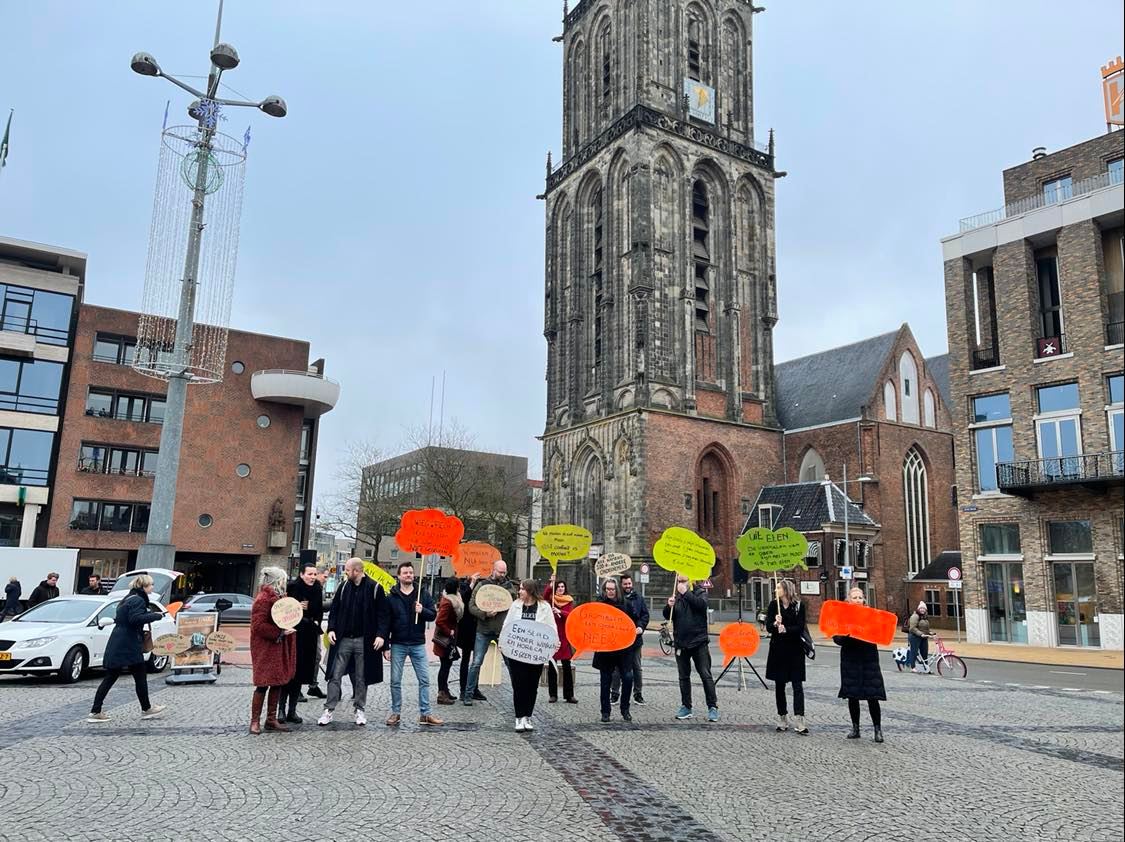 Verschillende ondernemers hebben zaterdagochtend actie gevoerd op de Grote Markt om aandacht te vragen voor de scheve compensatieregelingen die opgetuigd zijn door het kabinet.