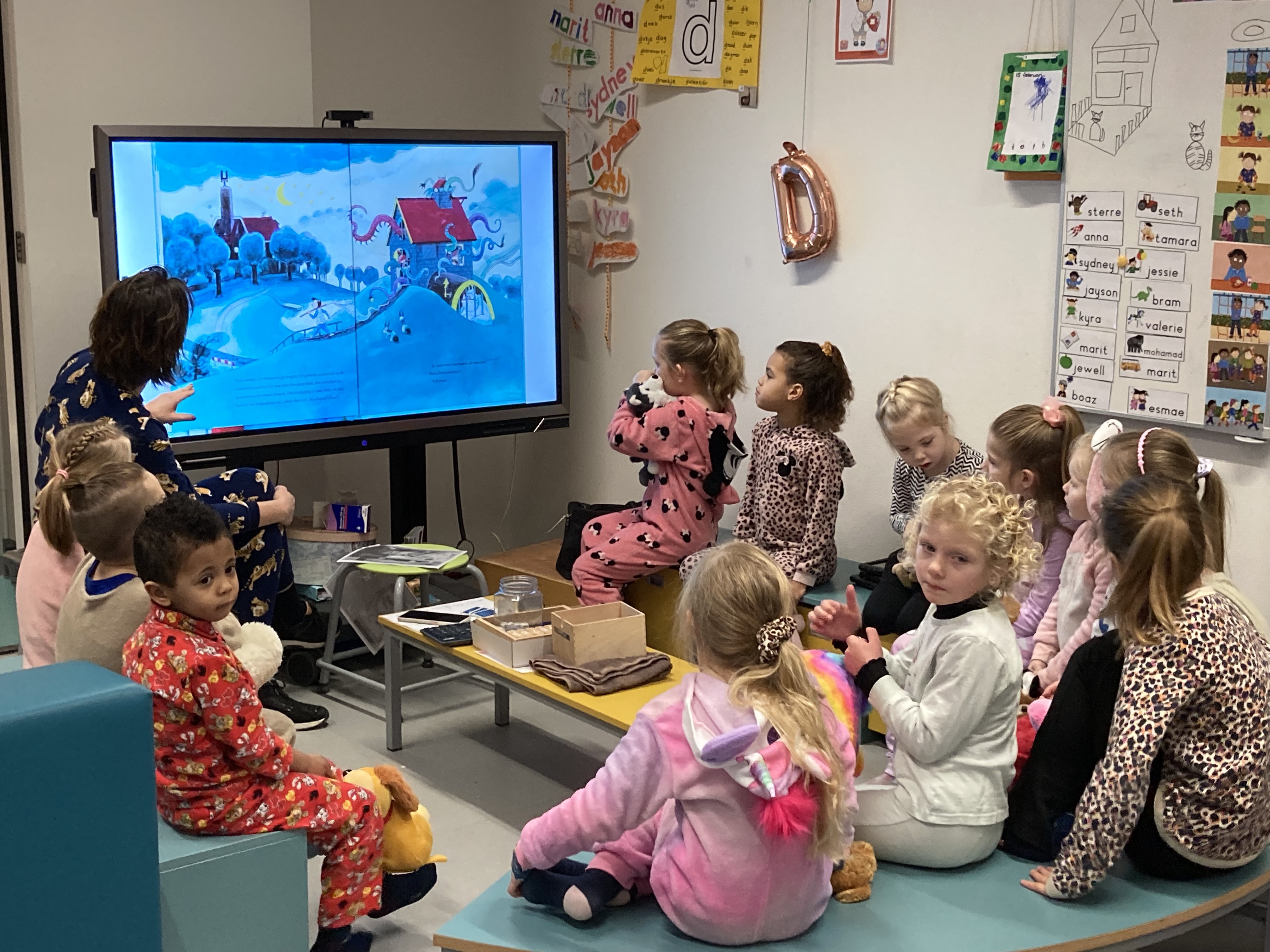 Met een pyjama-ontbijt werd het startsein gegeven voor de nationale Voorleesdagen, de campagne die in het teken staat van voorlezen aan jonge kinderen. Na het gezamenlijke ontbijt werd in alle groepen het prentenboek ‘Maar eerst ving ik een monster’ voorgelezen en op het digibord bekeken. Het boek, geschreven door Tjibbe Veldkamp en geïllustreerd door Kees de Boer, is verkozen tot Prentenboek van het Jaar 2022. Het staat centraal tijdens de voorleesdagen.